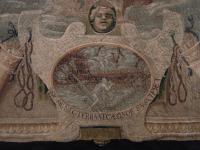 Bordures supérieure et inférieure : Diane ou Apollon entre un palmier et un olivier dans l’île de Délos, avec la sentence : « sic immota manet » (« Ainsi reste-t-elle immobile »), et deux rameaux d’olivier et de palmier entrecroisés, avec la sentence : « non frvstra ivpiter ambas » (« Ce n’est pas en vain que Jupiter [protège ou donne] les deux »). À mi-hauteur de la bordure de droite, monogramme « GG » entrelacés de la famille Grillo.