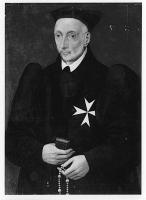 Portrait d'homme en buste, presque à mi-corps, de trois quart vers la gauche, tenant un livre dans sa main droite et un chapelet dans la main gauche. Il porte une livrée sombre ornée de la Croix de Malte, un petit col blanc et une barrette sur la tête.