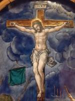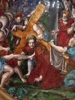 Ensemble de plaques : plaque ovale représentant la Crucifixion ; quatre bandeaux et quatre petits médaillons formant l'encadrement ; quatre médaillons d'angle (Portement de croix ; Mise au tombeau ; François II et Claude de France); six plaques reliant entre eux les médaillons (quatre anges portant les instruments de la Passion ; armes et devise de François Ier.