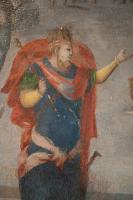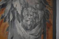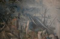 Usure générale de la couche picturale ; trou central correspondant au passage d'un tuyau de poêle ; le linteau de la cheminée, en faux marbre vert, pose des problèmes ; les photographies des années 1970-90 montrent à la place une frise de grotesques en camaïeu beige et blanc qui semble avoir été repeinte « à une date incertaine », vers le milieu du XVIIIe siècle (Oursel, 1995, p. 29) dissimulant le décor initial de faux marbre que l'on a depuis retrouvé (ou reconstitué?).